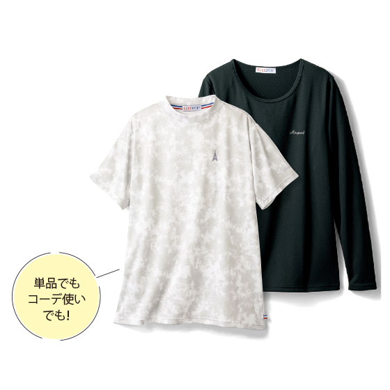 インナーは、裏メッシュで通気性がよく、軽トレに欲しい機能も充実のTセット。2枚を重ねて、単品使いでと着回せて、季節の変わり目の寒暖調節に便利です。フレンチテイストのロゴ入り※ロゴ…半袖は色ごとに配色が異なり、長袖は全色共通です。