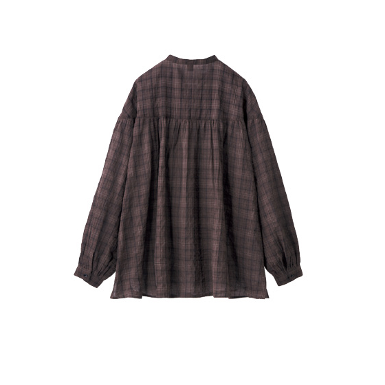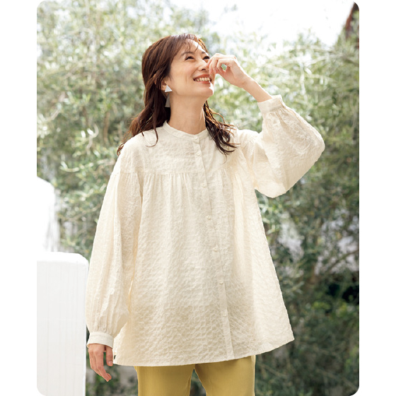 たっぷりギャザーのふんわりシルエット。バンドカラーでスッキり見せつつ、体形カバーも。表面感のある綿混素材でさわやかに着られます。
