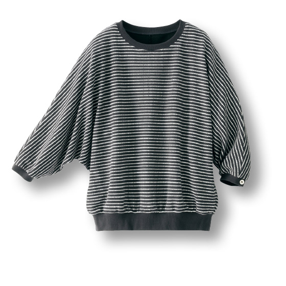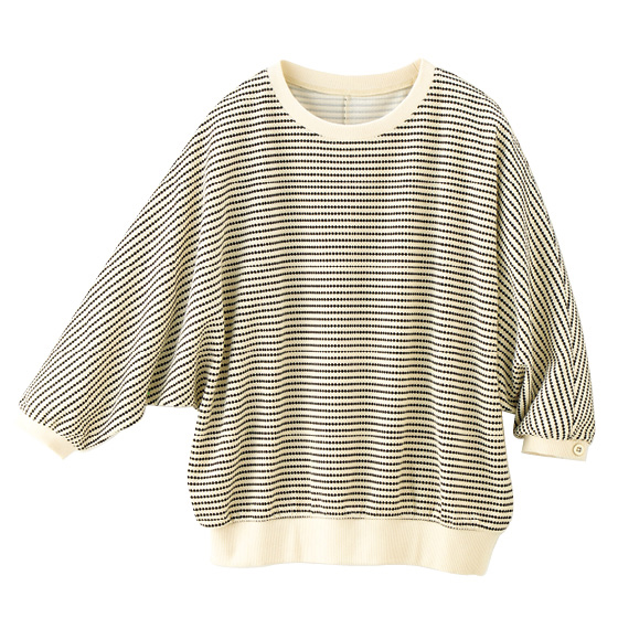 立体ボーダーの表情で、コーデのアクセントになるカットソー。ゆるっとリラクシーなシルエットでも、控えめなドルマン袖で上着も着られます。袖口に金色の飾りボタン付き。