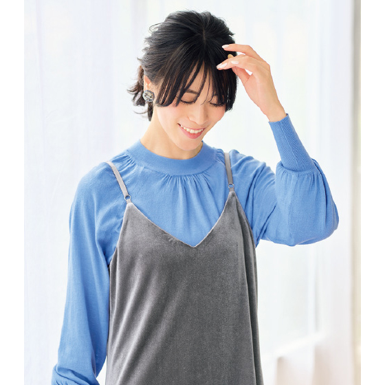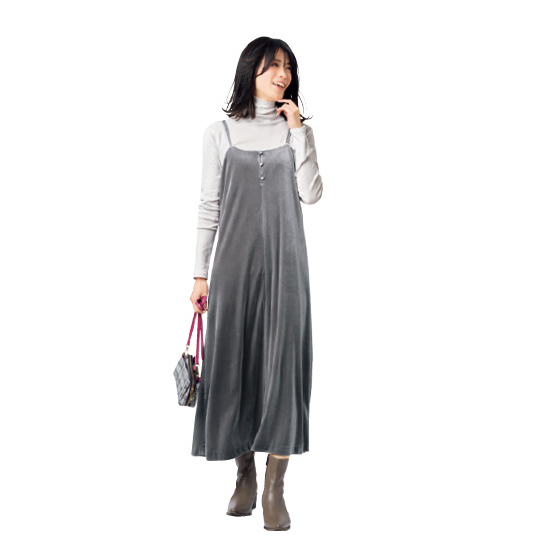 夏から秋へのスイッチ服に、あると便利なアイテム。半袖に長袖にとインナーを替え、前後2WAYで印象も変わる着回し力です。上品な光沢生地は広がりすぎず、きれいなフレアシルエット。肩ひもに長さ調節のアジャスター付き。