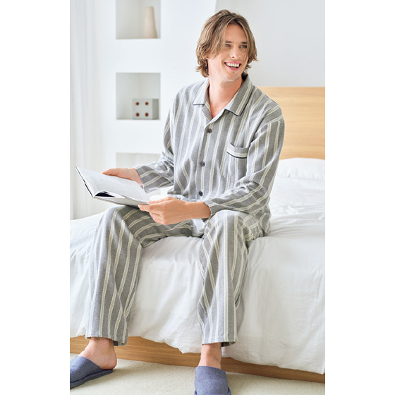 空気を含んで温もりを保つ中空糸を、織物の名産地・播州で織り上げたふんわりソフトなツイル起毛のパジャマです。椿オイル配合で風合いも心地よく、しっとり。