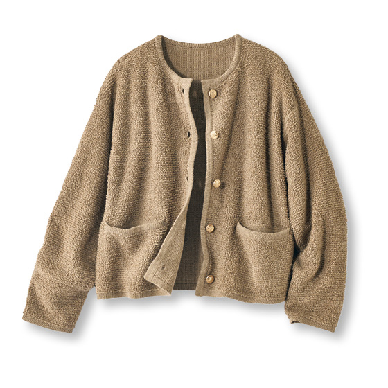 立体感のあるループ編みニットを、トリミングやアンティーク風ボタンで上品な印象に。カーデ感覚でサッとはおれて、タートルネックやシャツなどどんなインナーとも好相性。