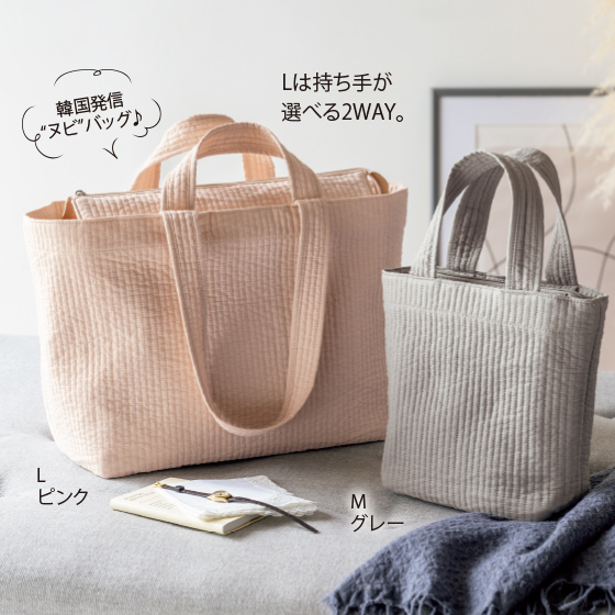 軽くて持ち歩きやすいトート。やわらかなキルティングの風合いが可愛い。