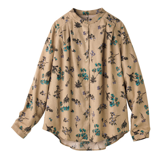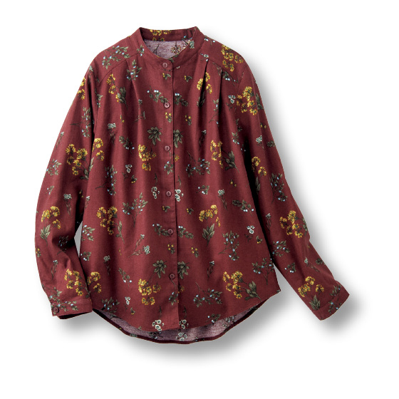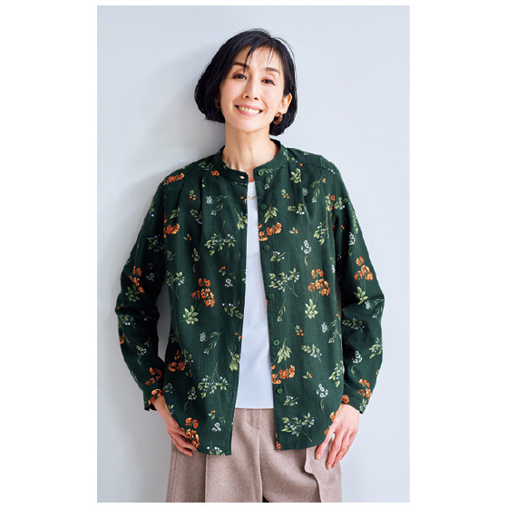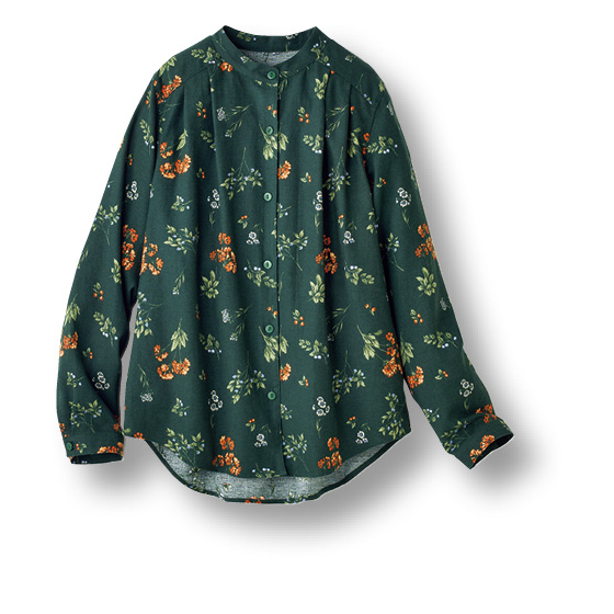 スッキリ品よく見えるスタンドカラー。前面にタックを入れてゆったり感をアップ。後ろ裾は長めでヒップをカバー。