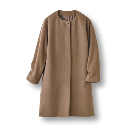 比翼仕立てに衿なしですっきり上品。ゆったり着られるノーカラーコート。