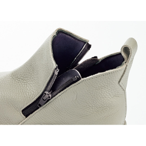 両サイドに斜めについたファスナーで脱ぎ履きがラク。