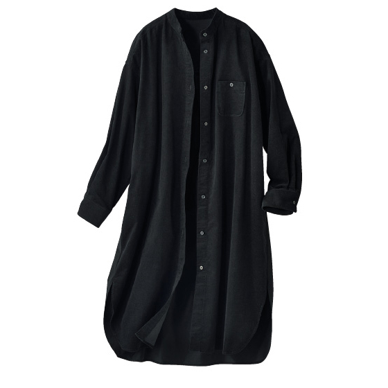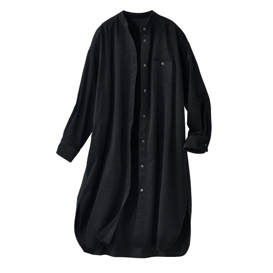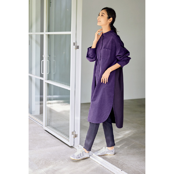 生地にカポック繊維を使用し、軽くてやわらかなコーデュロイに。すっきり見えるシルエットで、後ろ身頃はカットソー切替で軽やかな着心地です。