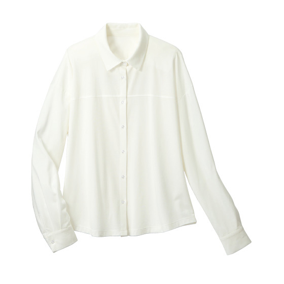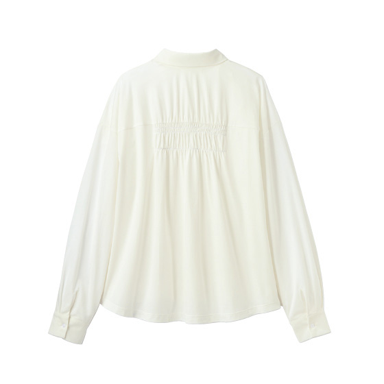 細糸をハイゲージ編みしたカットソーのブラウス。ほんのり透けて、シャリ感と光沢もある美素材です。背中に入れたシャーリングで、後ろ姿も自慢の映え感。