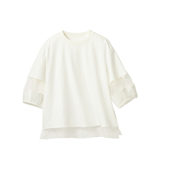 袖と裾のシアー切替が涼しげ。ボトムの上に着るだけで、インしたバランスに見えるカットソーです。体の線や二の腕カバーが叶うゆるシルエット。