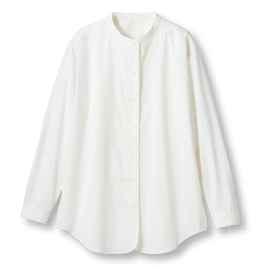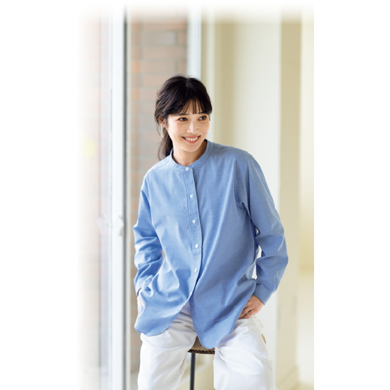 麻を少し混ぜて、ドライでナチュラルな風合いに。首元すっきりのバンド衿とさわやかな色で、1枚着でもはおりでも活躍します。シワになりにくくノーアイロンでお手入れもラク。