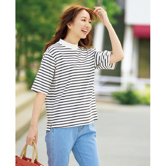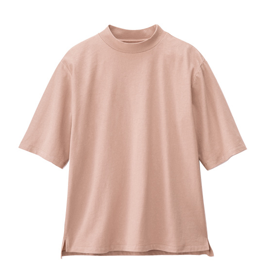 ボトルネックで首回りを、5分袖で二の腕をカバーできるプルオーバー。