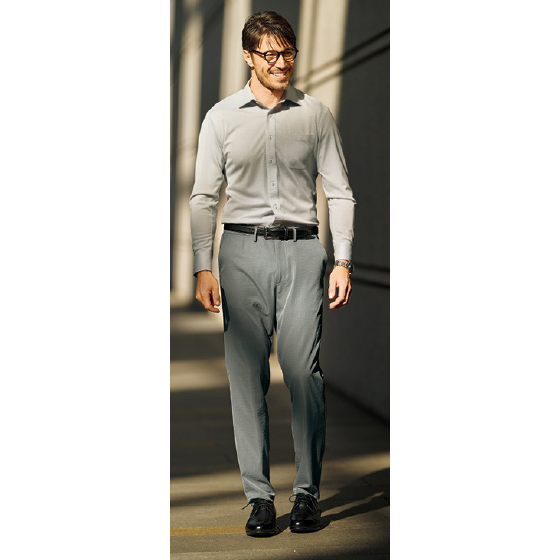 上品なつやとこなれた印象のストレッチチノ素材。吸水速乾、UVカット機能があり、シワになりにくいのも魅力。セットアップでも着られます。※通年着用できます。
