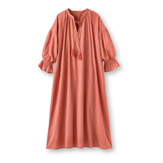 立体的なジャカード素材が目を引くワンピース。袖口のゴムシャーリングやタッセル使いなど、細部にまでこだわりが光る1枚に。