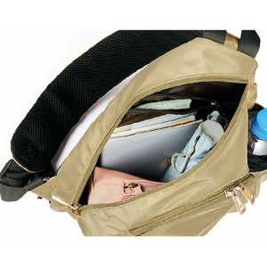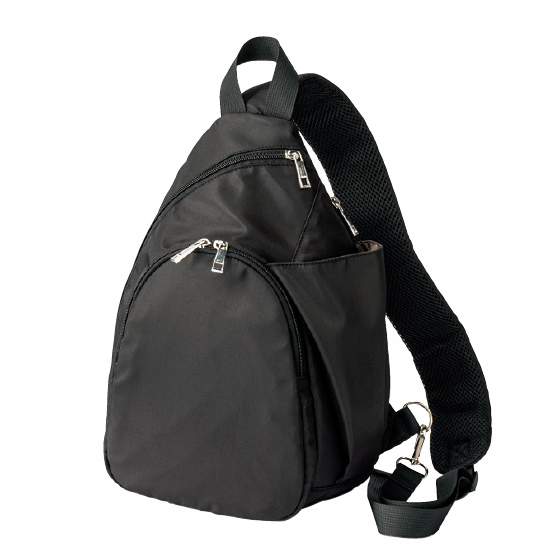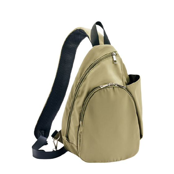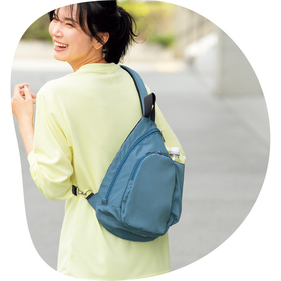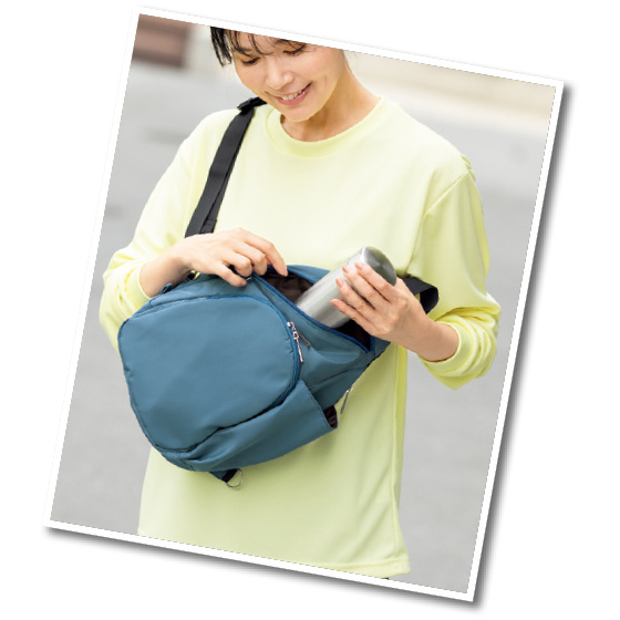 メイン収納は背面に貫通ファスナーがあり、左右から出し入れ可能。Dカンで肩ひもを付け替えられ、左右どちらの肩掛けもOK。