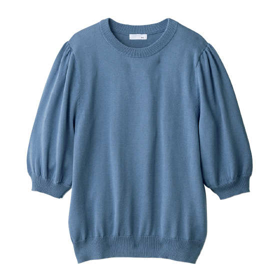 柔らかな中にシャリ味のある夏ニット。ギャザー使いの映え袖が、今見えしながら二の腕カバーも。着回しやすい色味で秋まで活躍。