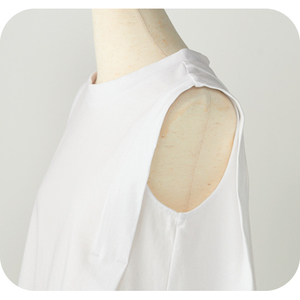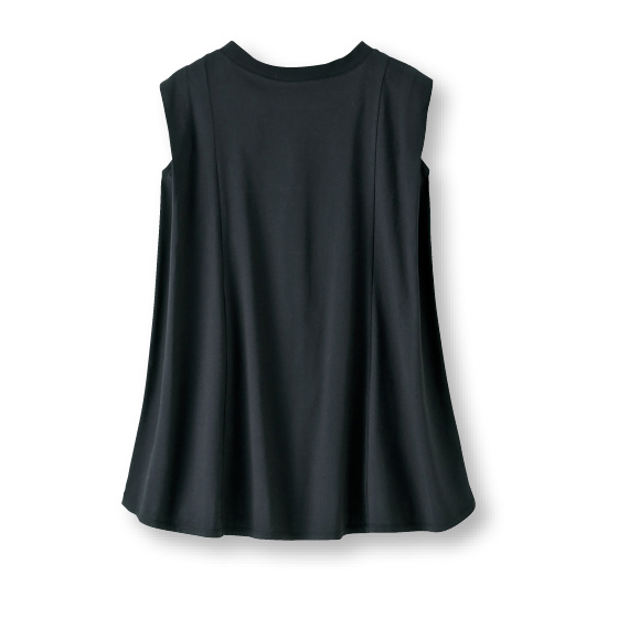 前振りのタックと後ろフレア、わきが見えにくい設計で360°きれい見え。接触冷感の綿100%カットソーで、着心地もサラッと涼やか。