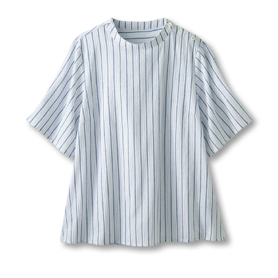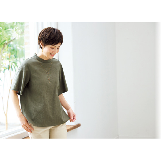 適度な厚さのコットン100%。ビンテージ加工で程よいシワ感を表現。低めのハイネックで首元すっきり。程よいフレア感で、体のラインを拾いにくい。