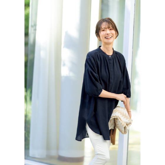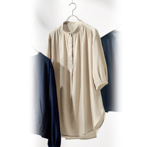 フレンチリネンのシャリ感と、レーヨンのしっとり感。2つの持ち味をミックスした、いいとこどり素材です。リネンの清涼感はそのままに、柔らかな着心地と上品な落ち感が楽しめます。