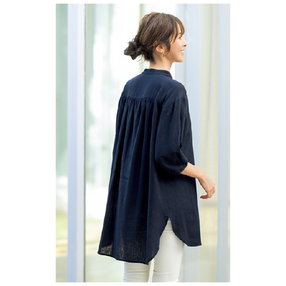 ※製品洗い加工のため、商品により仕上がり寸法・色の出方が異なります。麻素材の特性上、生地の表面にネップ(黒っぽい小さな粒)やスラブ(不規則な筋)が出ます。前後の丈に差があるデザインです。