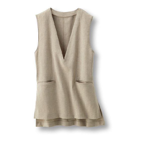 さわやかなハリ感とサラサラの清涼感。麻見えするのに手間なしケアのベストです。サクッとかぶりで着て、深いVネックとウエストダーツで細見え。なのに体のラインをすっきり隠せて安心。