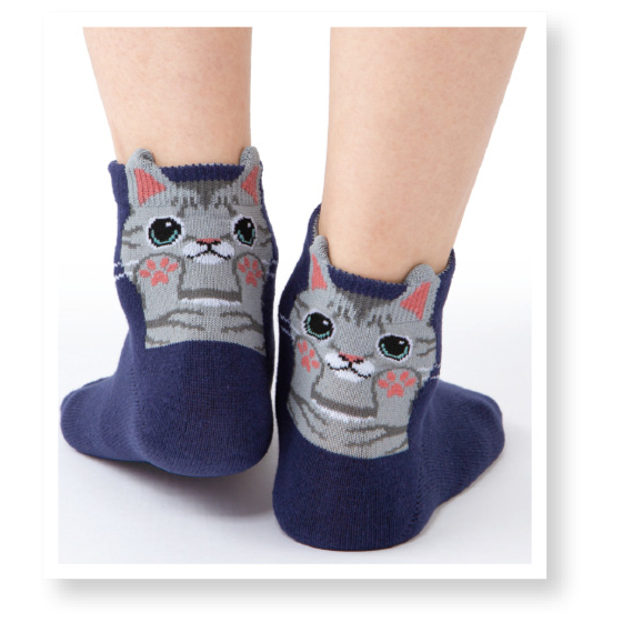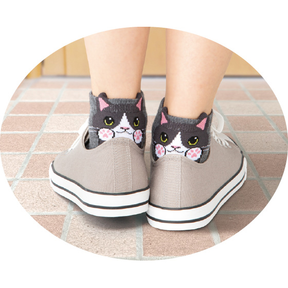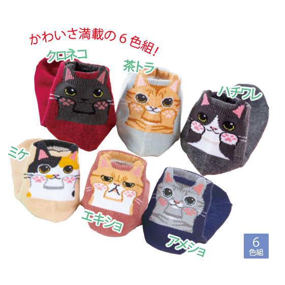 靴を履くと、かかとから可愛いにゃんこが顔を出す楽しいショート丈ソックス。しっかりとした綿混素材です。いろんなにゃんことお出かけできる、6色セット。