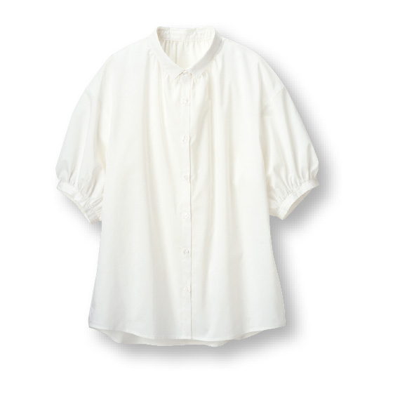 小さめの衿がほどよいきちんと感とフェミニンさを両立。ギャザー入りのふんわり袖が華やかさもプラスしてくれます。リネンをブレンドした清涼感ある素材で夏も心地よく♪