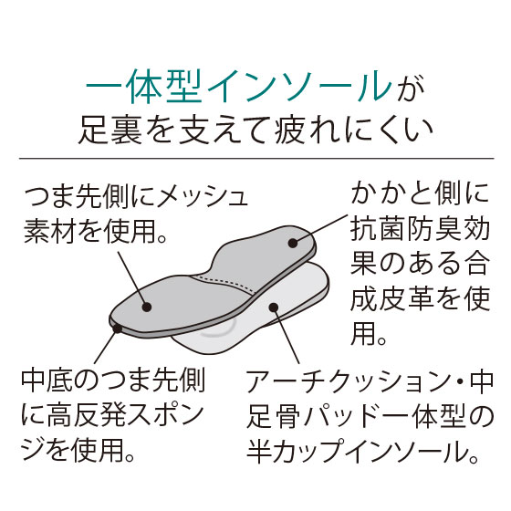 返りのよい底とストレッチ素材でやわらかく足になじんでラク。