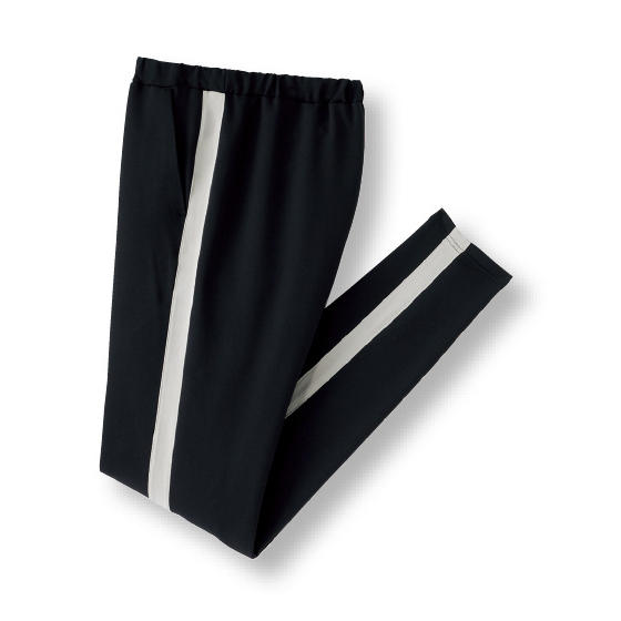 両サイドのラインでほっそり美脚見せ効果も。ウエストが調整できるスピンドル入り。両サイドにポケット付き。