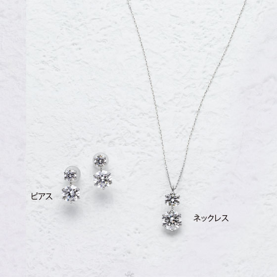 ラウンドブリリアントカットを施した大小2連のペンダントと、大小のモアサナイトが軽やかに揺れるピアスのツインシリーズ。