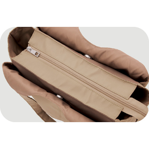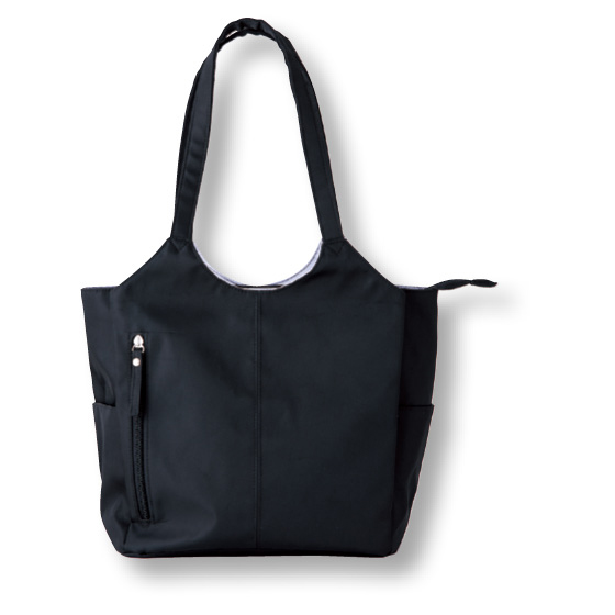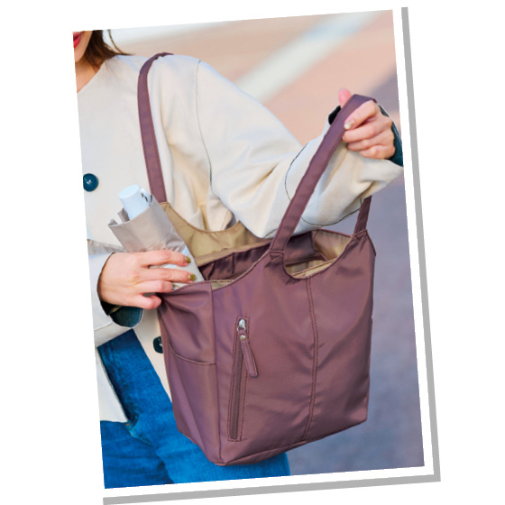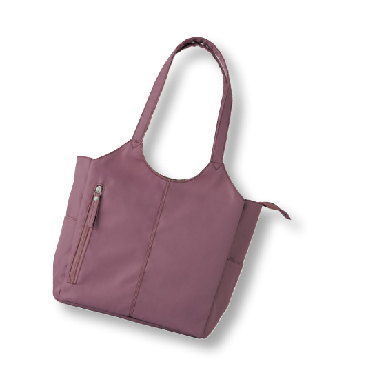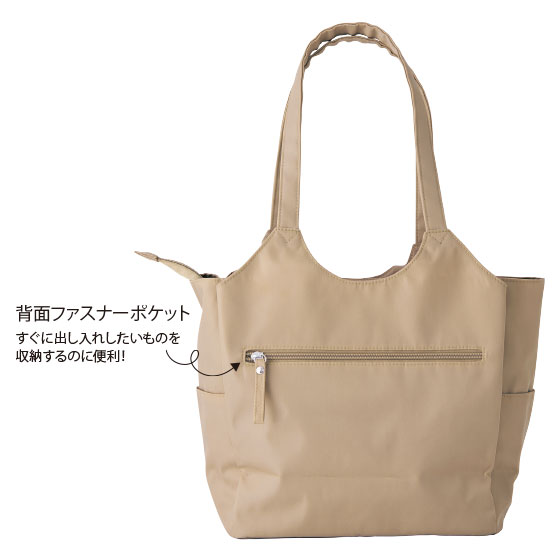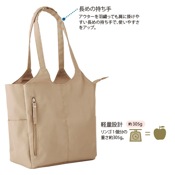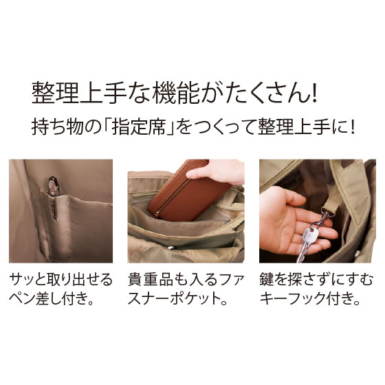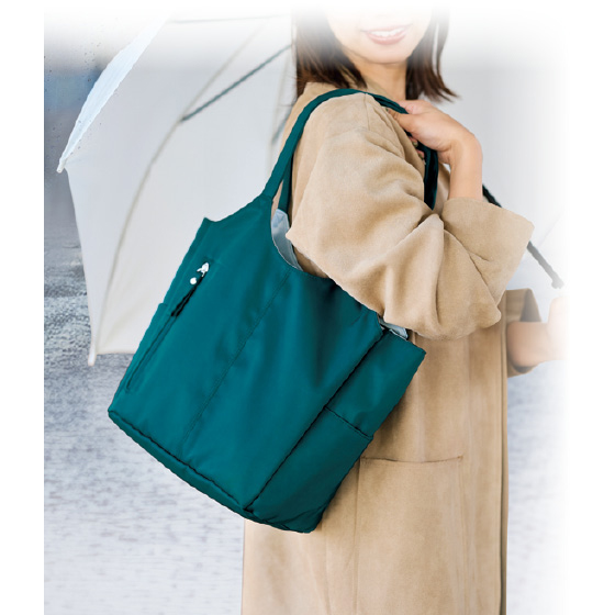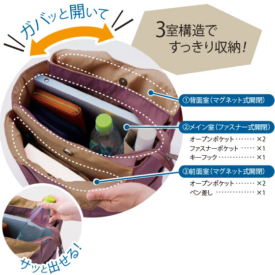 濡れてもサッと拭けて水をはじくので、雨の日でも気兼ねなく持てる!ガバッと開いて、3室構造ですっきり収納!肩に掛けたまま中身を取り出しやすい!