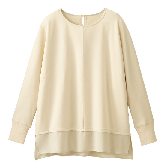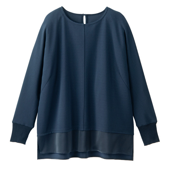 光沢感のある別生地の裾はレイヤード風に見せつつ、体形カバーにも。ドルマン袖の袖口は、腕まくりしやすいリブ使いです。