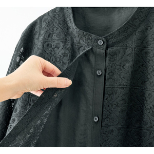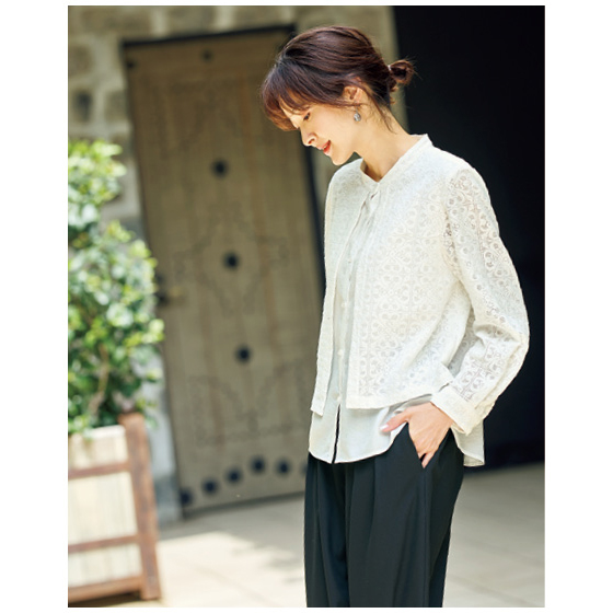 無地の身生地にレースをドッキング。重ね着風に見えてサマになるブラウスです。袖はレースのみを使用し、甘すぎずに抜け感も。着心地も涼やかです。