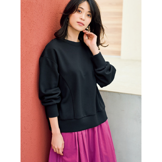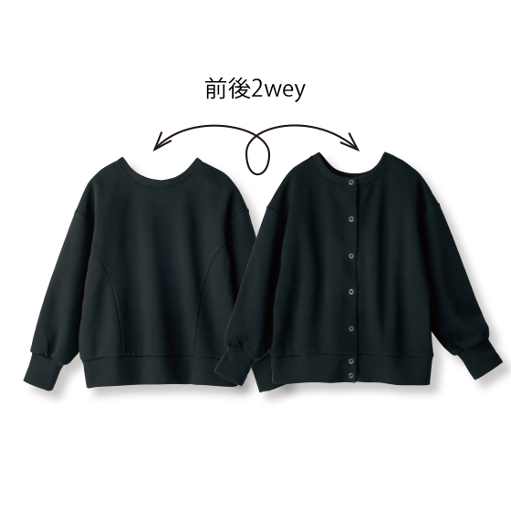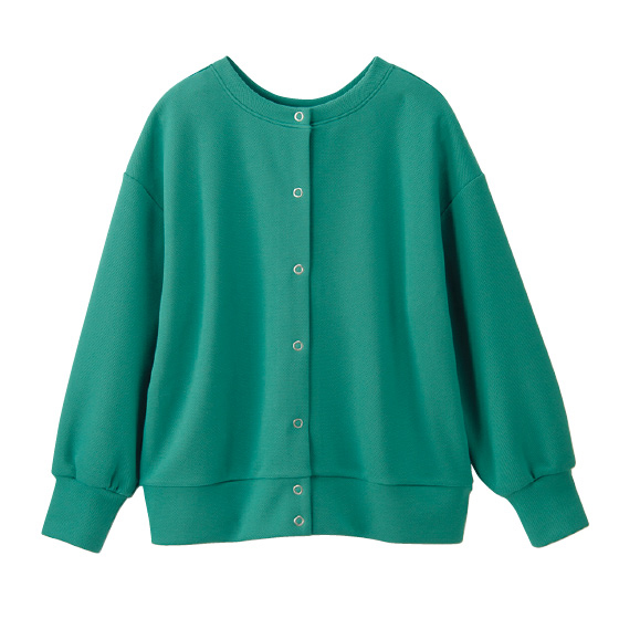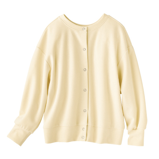 表側はニュアンスのある鹿の子地。軽くストレッチ性のある裏地と2枚仕立てできちんと感があり、間に空気を含んでふんわり軽やか。カーディガンとしてはもちろん、前後を変えてプルオーバーとしてもすっきり着られます。重ね着にも重宝で、長く着回せます。