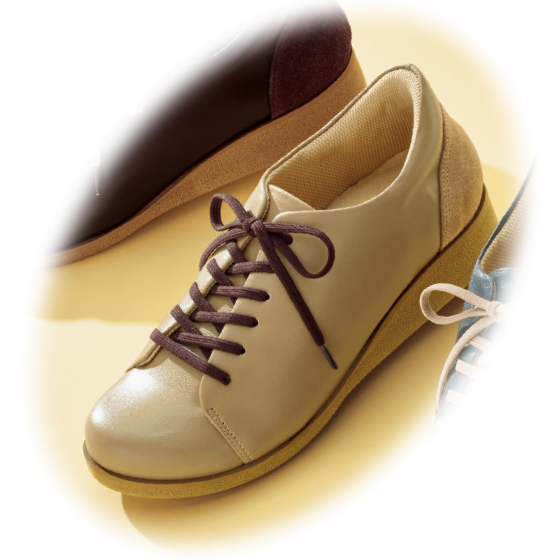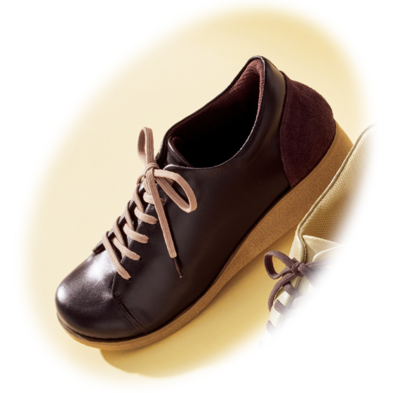 ラウンド型ヒールがかかとの着地をサポート。安定感のある中敷が足裏にフィット。屈曲性のある靴底でけり出しやすい。