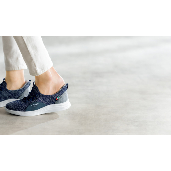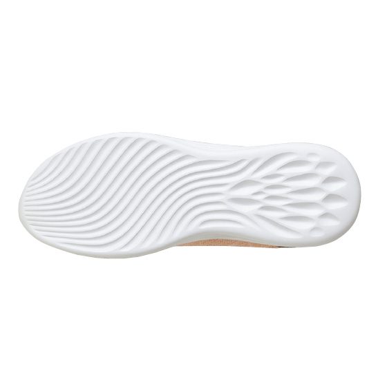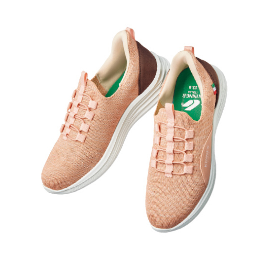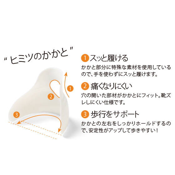 かかと部分に特殊な素材を使用しているので、手を使わずにスッと履けます。穴の開いた部材がかかとにフィット。靴ズレしにくい仕様です。かかとの左右をしっかりホールドするので、安定性がアップして歩きやすい!