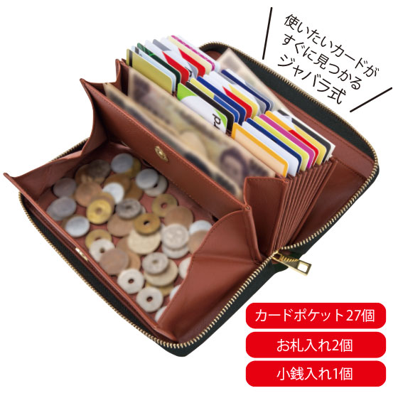 ●仕様:開閉=ラウンドファスナー式、ポケット=内部にジャバラ式カード入れ27個・札入れ2個・マグホック付きボックス型小銭入れ1個付き