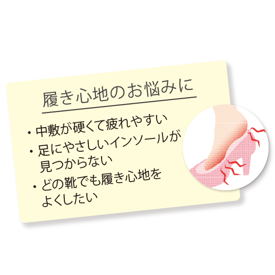 足にやさしい、ふかふかクッションのインソール。足裏の3点アーチを支えて歩行をサポート。