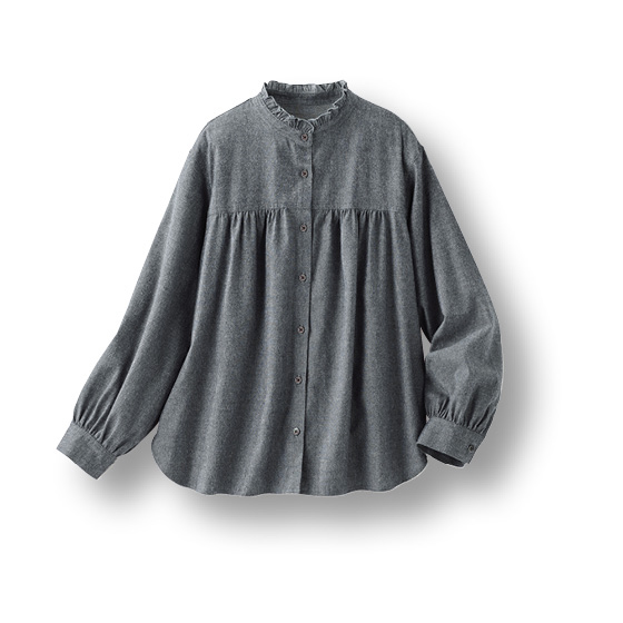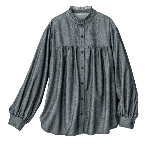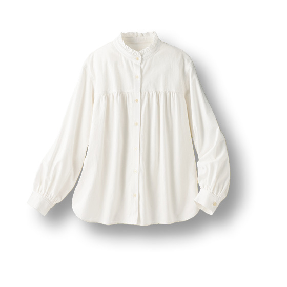 やわらかな風合いの綿混生地作ったブラウス。衿フリルや切替下のギャザーで大人フェミニンな印象に。シンプルすぎないので1枚で着ても華やぎ、重ね着にも活躍。
