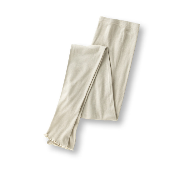 ふんわり軽く透け感のあるガーゼ調素材。おなかをすっぽり包む、深めの股上丈。裾は長め丈&フリル調メロウ仕上げ。