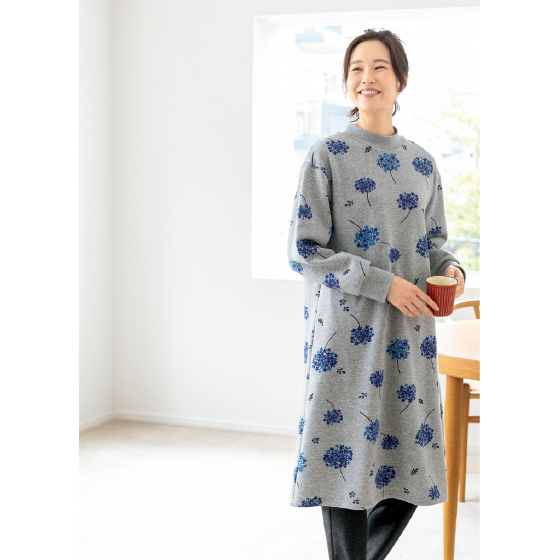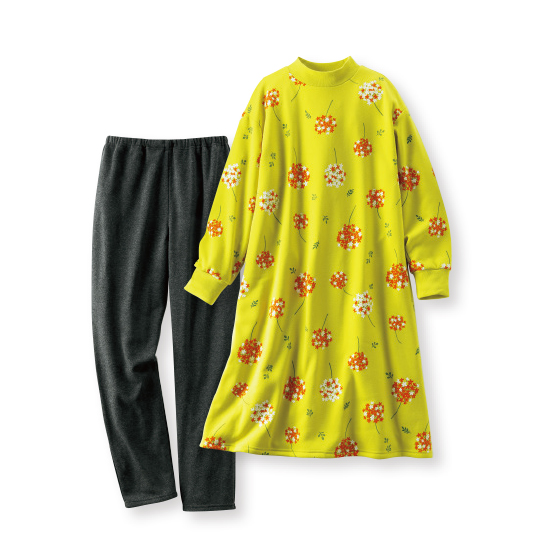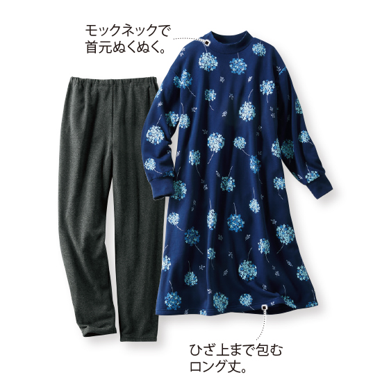 ふっくらソフトな綿混ニット素材を、裏起毛で暖かく。トップスはすとんと着てワンピ見え、パンツはすっきりシルエットで動きやすさも◎。