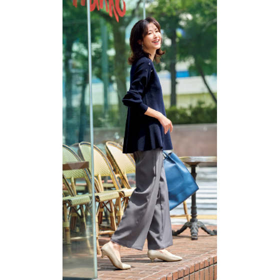 1枚でお出かけ感の出る映えニット。胸元に散りばめたビジューは、1粒使い&ブローチ風に3粒使いで華やか。背中はビジューなしでゴロつきにくい。