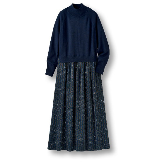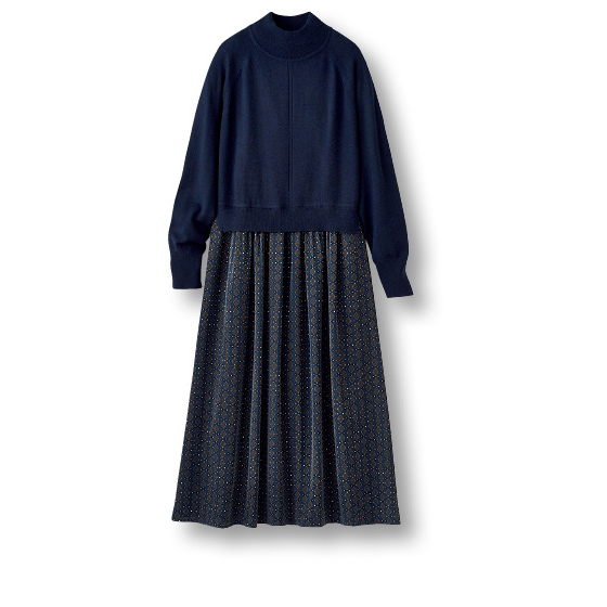 天竺ニットに、小紋柄のさらさらスカートが合体。悩まず時短でお出かけ支度ができるワンピです。ネイビー系には、きちんと感も映え感も。