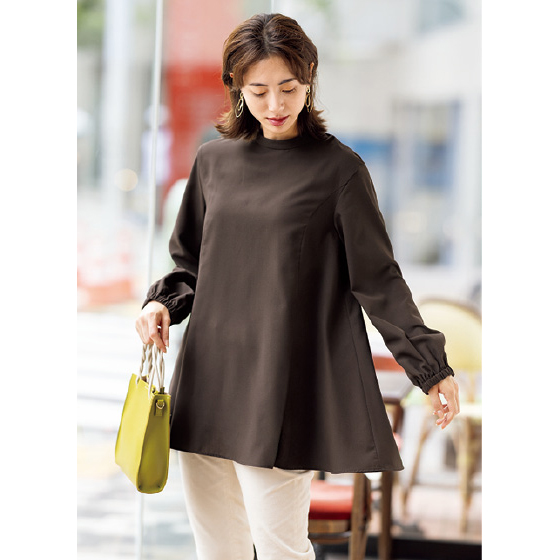 見た目も肌触りもまるでコットンなのに、洗濯ジワやたたみジワがつきにくい機能素材。ふんわり裾フレアもほのかな落ち感で広がりすぎず、1枚で着ても重ね着でも活躍です。