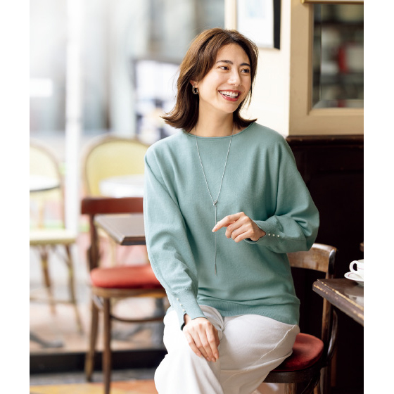 着るだけで柔らかなシルエットが出るドルマンニット。体の線をきれいに隠して細見えします。着回し感のよいシンプルさでも、袖口の飾りパールが華やぎプラス。