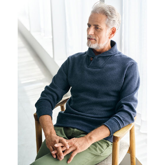 表面に凹凸のあるしなやかな素材。裏起毛で肌触りもふんわり暖か。小ぶりなショールカラーが上品。