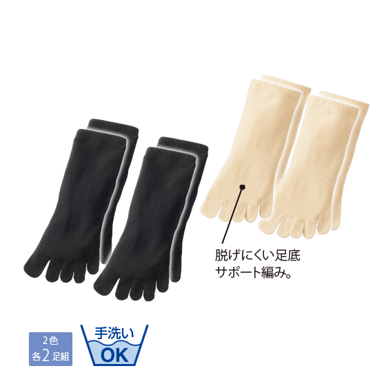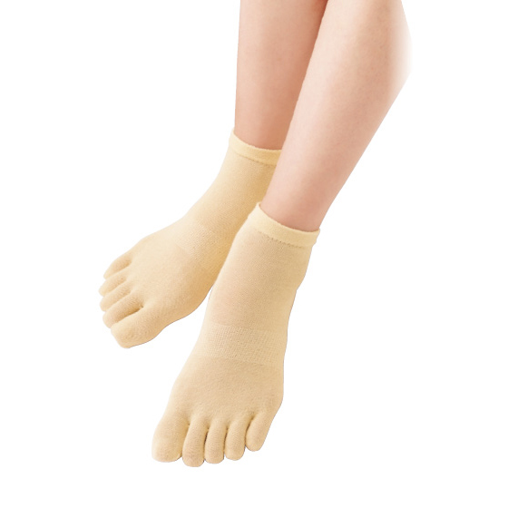さわやかな綿混素材。5本指でムレにくい。長綿糸を特殊紡績し、薬品を混ぜることなく、撚ることでひんやり感を持たせた素材。吸水・速乾性も◎。