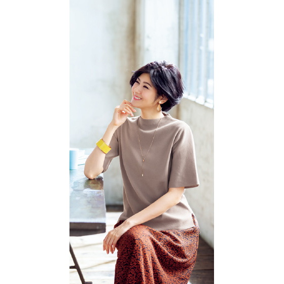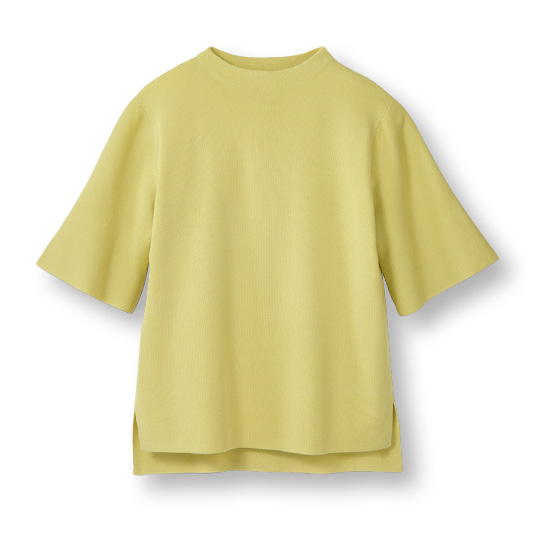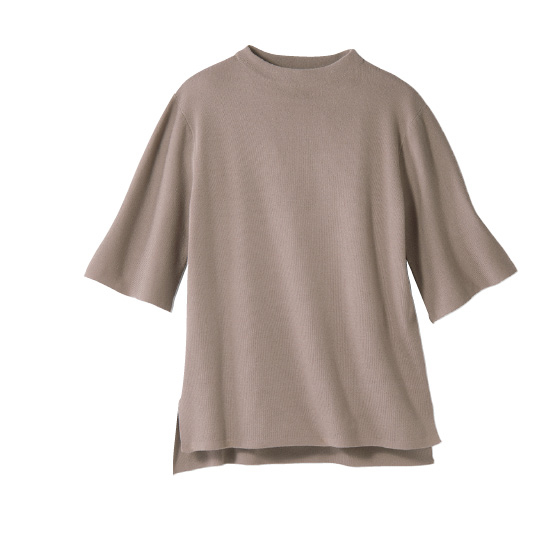 コットンアセテート混のドライタッチな素材。薄手でもしっかりした風合いの総針編み。体のラインもひろいにくく、1枚できれい見え。洗濯機で洗えて、汗ばむ夏も気持ちよく着られます。低めのモックネック。