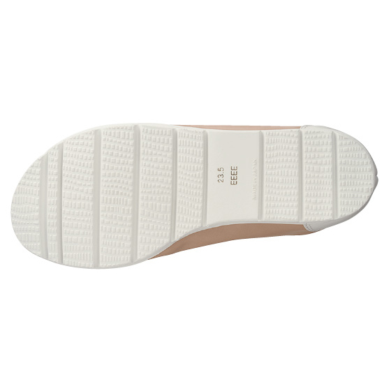 シャモジのような丸みのあるつま先で、足指のびのび。丸い形状のヒールで、かかとの着地をやさしくサポート。足裏を支える立体的な中敷とグイッとしなる靴底で、疲れにくい。