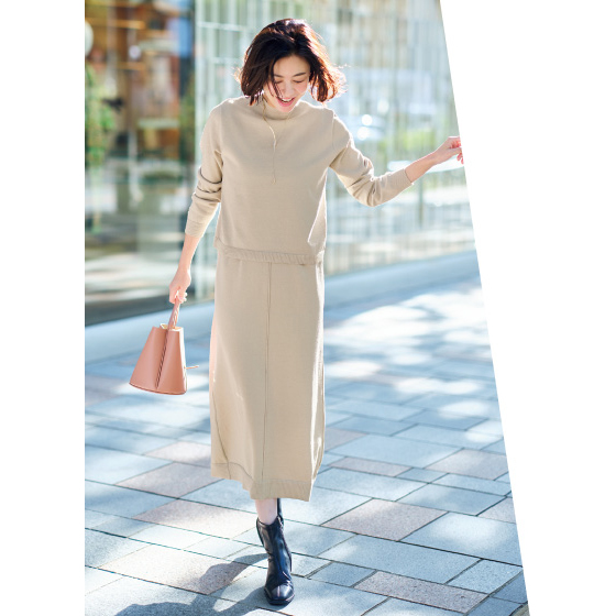 表側はつや感のある素材、肌側はコットンの春に心地よいワンピ&プルオーバー。体を締めつけず、体形も拾いにくくて着映え感があります。夏にはワンピ1枚でと長いシーズン活躍。