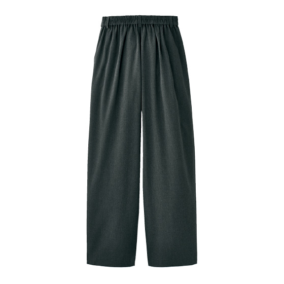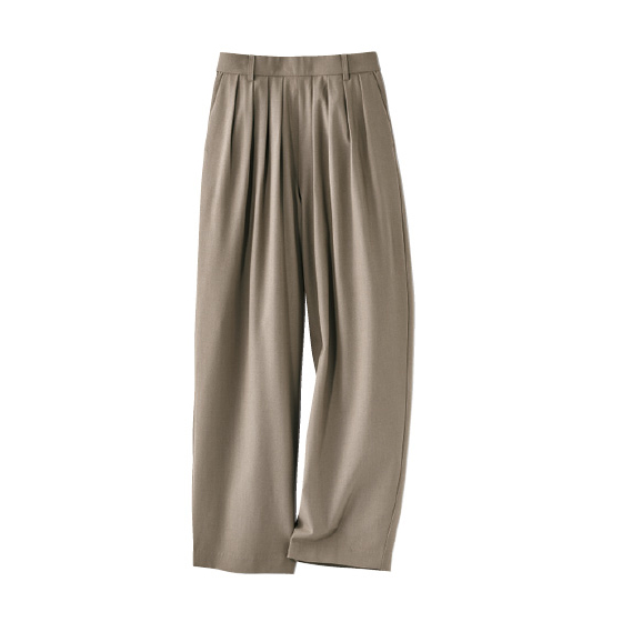 タック効果でお腹をカバーしながら、腰回りゆったり。裾に向かってゆるくカーブする旬シルエットです。さらっとしたウール調の上品生地が、きちんと感で大人映え。※通年着用できます。